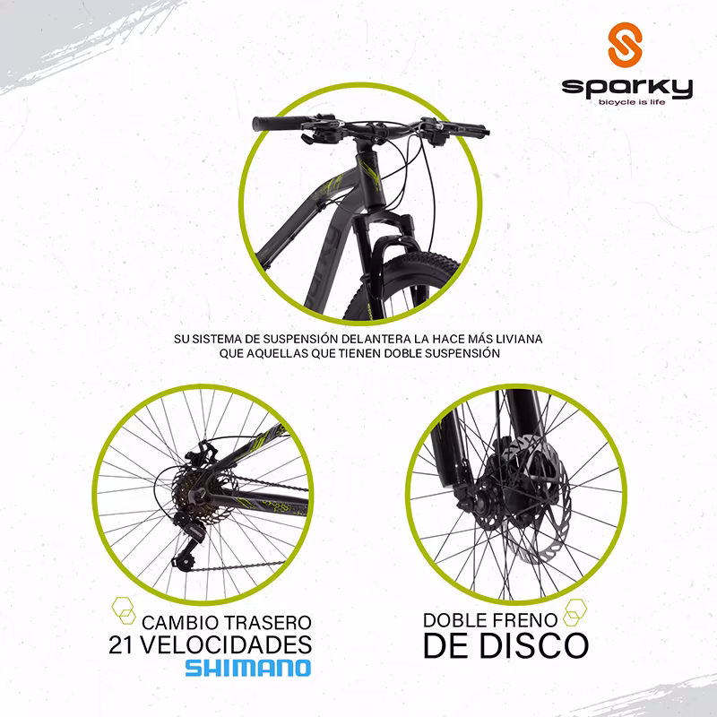 21 velocidades tipo rapid fire con ventana de indicador de velocidades; suspensión delantera. Llantas antideslizantes con dibujo para una excelente tracción y manejo. Podrás utilizarla en todo momento como medio de transporte o en modo recreativo en las rutas que más te gusten.