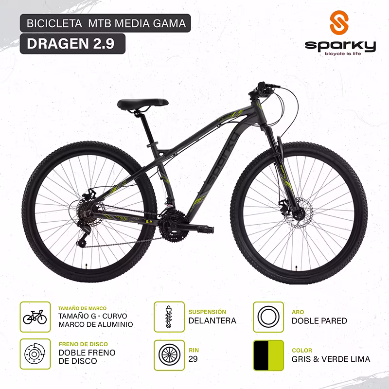 Dragen 2.9 es una bicicleta rodada 29 de gran rendimiento; Excelente para pasar momentos súper divertidos y placenteros; te ayudará a crecer en el ciclismo de montaña. Cuadro de aluminio de alta resistencia.